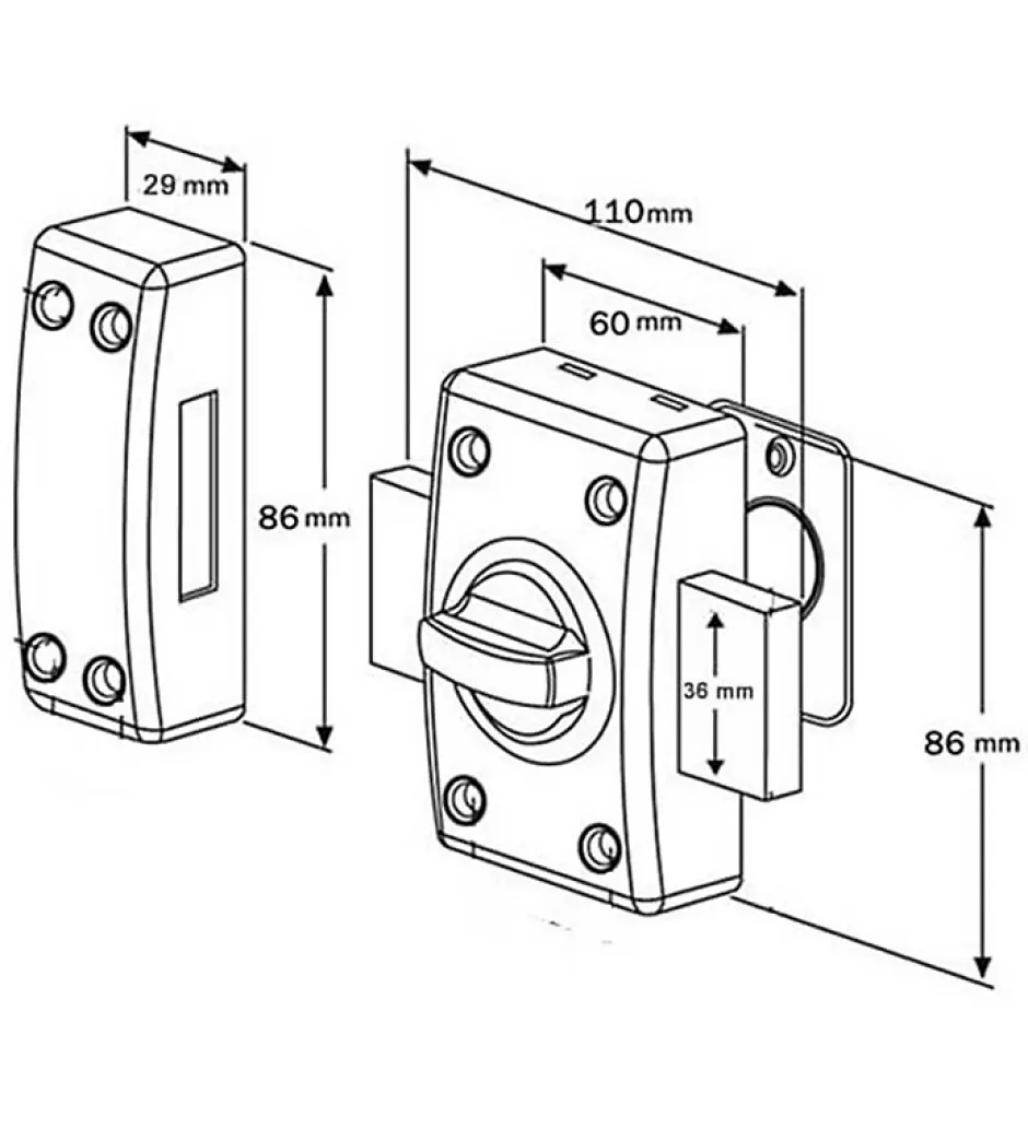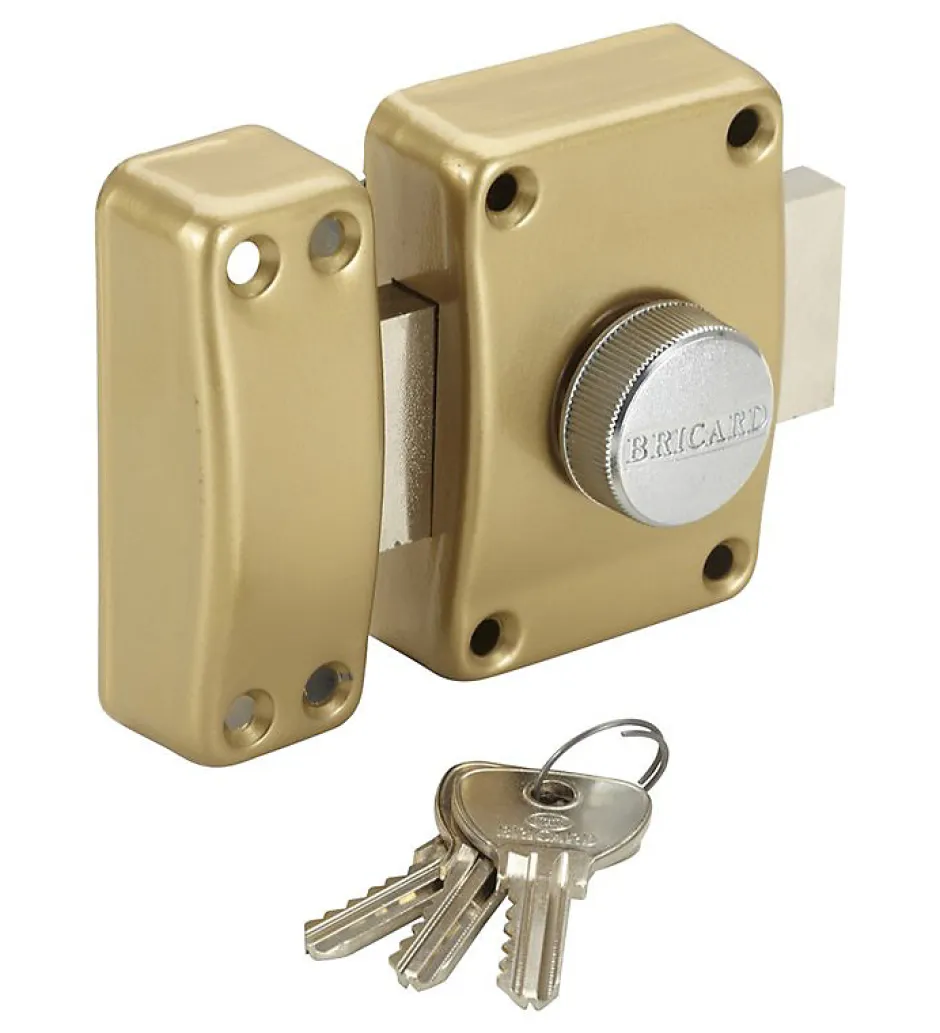 Verrou de porte avec cylindre de 50 mmFermeture par cylindre avec coté intérieur à bouton et extérieur à clés.Détails du verrou Bricard: – Modèle : Astral 1953- Type de verrou : Coté intérieur à bouton et extérieur à clés.- Protection renforcée contre le crochetage par des contre pistons multiformes- Coffre et gâche réversible : la gâche peut se positionner à gauche ou à droite du coffre. – Coffre et gâche en acier embouti- Pêne en acier – Livré avec 3 clés crantées – Livré avec notice de pose, vis et accessoires. Dimensions :- Coffre (hxl): 86 mm x 60 mm- Gâche (hxl) : 86 mm x 29 mm- Pêne (hxl): 36 x 110 mm- Cylindre : Ø 21 x 50 mmCe que nous aimons : Ce verrou de sécurité à bouton est réversible, la gâche peut se positionner à gauche ou à droite du coffre. Ce verrou à cylindre avec un coté intérieur à bouton et extérieur à clés est livré avec 3 clés crantéesCe verrou de porte bénéficie d’une protection renforcée contre le crochetage par des contre pistons multiformes.