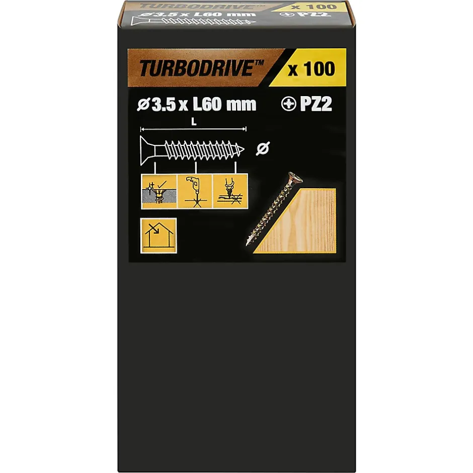 Les 100 vis à bois premium zinguées jaunes à double tête fraisée de ce pack sont fabriquées à partir d’acier. Elles mesurent 60 mm de long et ont un diamètre de 3,5 mm. Elles sont idéales pour tout un éventail de projets de bricolage.