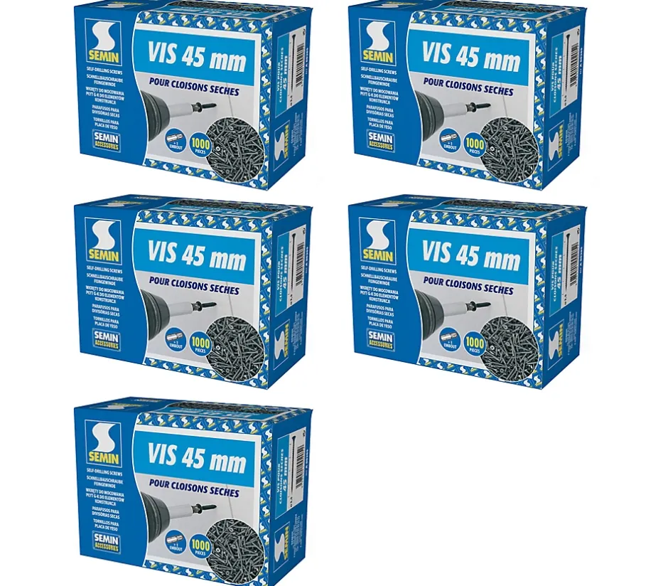 VIS EN ACIER PHOSPHATÉ DE 45 MM – QUALITÉ PROFESSIONNELLEPourquoi choisir les vis 45 mm Semin ?La vis de la marque Semin répond aux diverses normes en vigueur et s’adapte parfaitement au montage des plaques de plâtre. On l’utilise notamment pour fixer la plaque de plâtre BA13, modèle le plus courant.Ce pack contient :- Vis Auto Perceuse 45 mm, 5 boites de 1000LES AVANTAGES DE LA VIS 45 MMLa vis 45 mm présente de nombreux avantages pour une ossature d’intérieur. On la choisit donc pour ses atouts :- Une résistance au brouillard salin (48 heures) ;- Un double phosphatage ;- Un montage aisé des plaques de plâtre – Une belle qualité professionnelle.CARACTÉRISTIQUES DE LA VIS PLAQUE DE PLATRELa vis TTPC (ou vis auto perceuse tête trompette point clou) sert à la fixation des plaques de plâtre sur l’ossature. Cette vis en acier phosphaté, pour cloisons sèches de 45 mm, est particulièrement adaptée aux plaques de plâtre . Concernant la consommation, comptez 14 par m² et 4 par mètre linéaire.Dimension produit : 3.5 x 45mmMatière : Acier phosphatéForme : Auto perceuse tête trompette pointe clouConsommation moyenne : 14 (par m2)Domaine d’application : Montage des plaques de plâtreNorme : Conforme au DTU 25.41Quantité : boite de 1000 vis