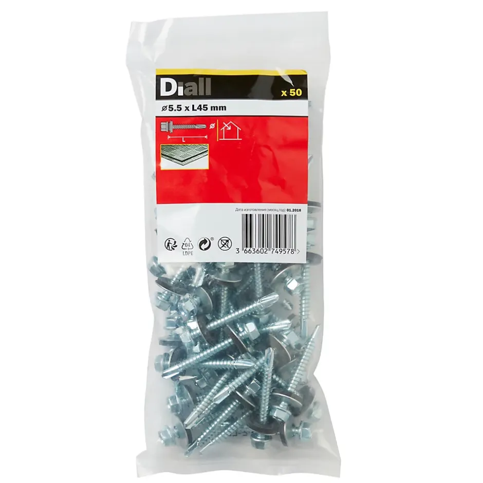 Vis de bardage. . Longueur du produit : 45 mm. Diamètre du produit : 5,5 mm. Type de filetage : Auto-perçant. Type embout : Pointe trempée. Quantité par pack : 50.