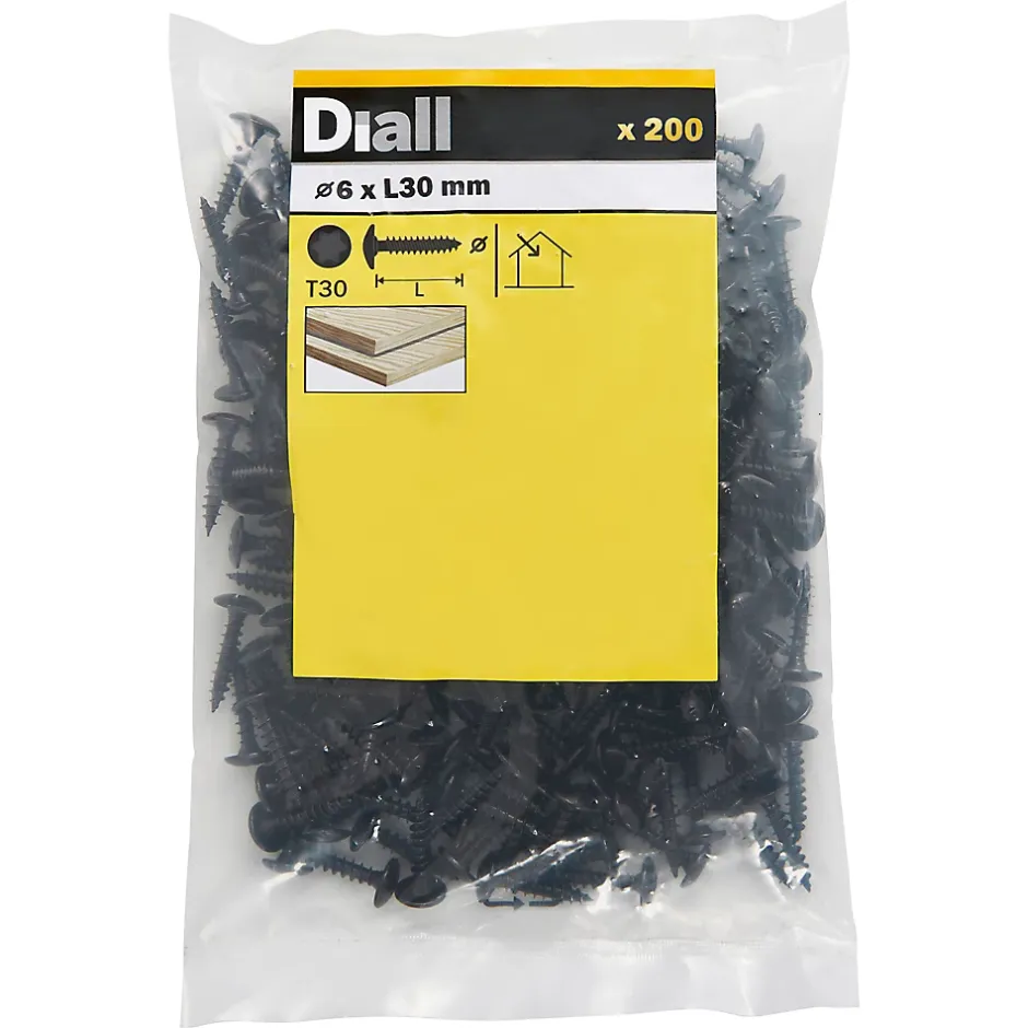 Vis de charnière. Adapté à l’assemblage de structures en bois. Hauteur de la tête : 3,2 mm. Couleur : Noir. Longueur du produit : 30 mm. Diamètre du produit : 6 mm. Type de filetage : Filetage unique.