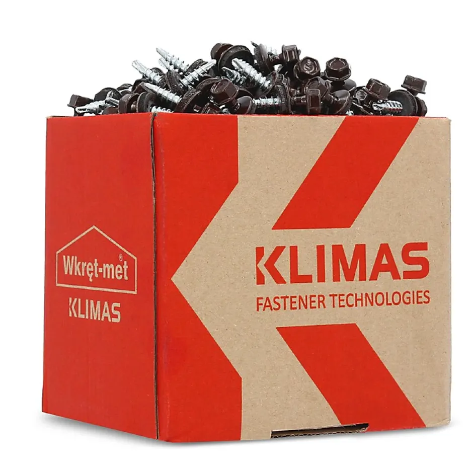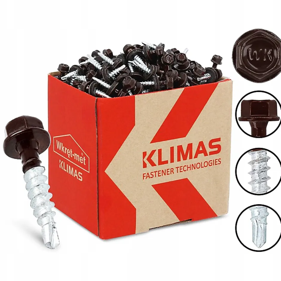 Vis de toiture auto-perceuses Klimas WFD pour tôle trapézoïdale sur bois – zinguées / revêtement RAL Vis auto-perceuses destinées à la fixation de tôles trapézoïdales et profilées sur des structures en bois. La pointe auto-perceuse permet une pose rapide sans pré-perçage et assure une fixation fiable, adaptée aux travaux de toiture et de façade. Applications Fixation de tôles trapézoïdales et profilées sur bois Fixation des recouvrements et éléments de finition (faîtage, rives, tôles de pignon, angles) Toitures, façades et montages muraux (garage, carport, véranda) Caractéristiques Acier trempé, zingué électrolytiquement Disponible avec revêtement couleur RAL (durci thermiquement) Tête hexagonale pour un vissage efficace Pointe auto-perceuse pour une mise en œuvre rapide Rondelle d’étanchéité avec joint EPDM pour une protection durable contre les intempéries Qualité et usage Bonne résistance à la corrosion Convient aux applications courantes et professionnelles Fabrication conforme aux exigences de qualité Information : la couleur RAL dépend de la variante sélectionnée (code RAL indiqué dans la référence produit).