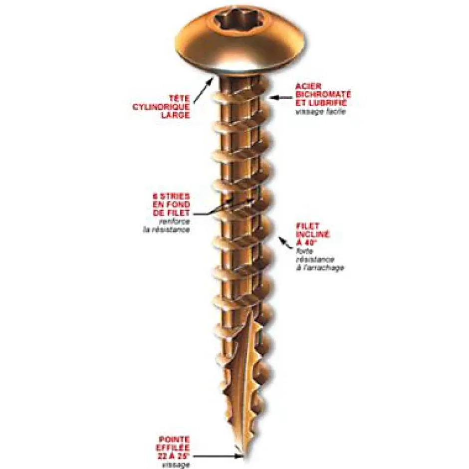 Vis penture étoile acier noir. Dimensions : Ø 6 x 30 mm. En Vybac de 32 pièces.Entaille coupante : suppression du fendage du bois. Empreinte étoile pour un maintien parfait de l’embout de vissage. Spéciale travaux en série : augmentation de la vitesse et de la puissance de vissage. Pointe effilée 22 à 25° : vissage précis. Filet incliné à 40° : forte résistance à l’arrachement. 6 stries en fond de filet : renforce la résistance..