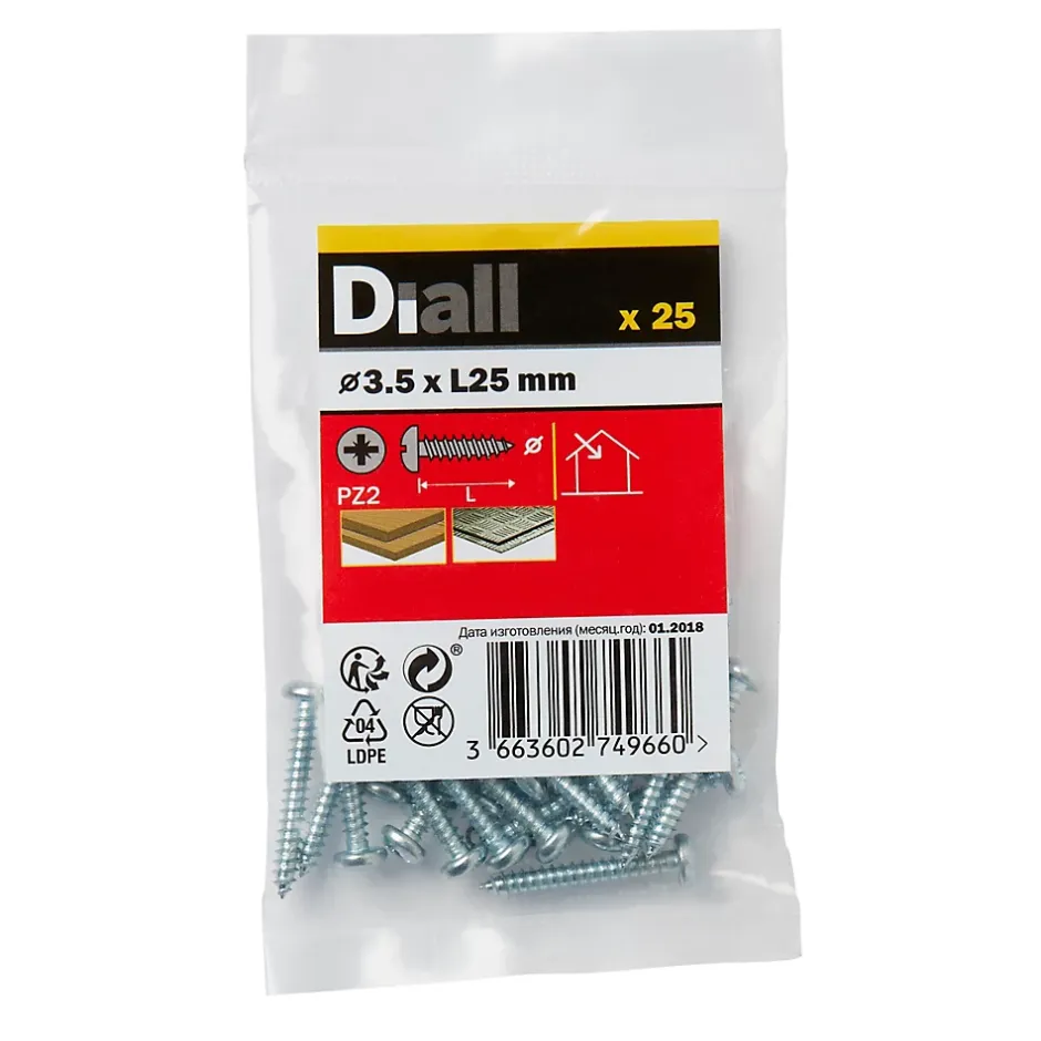 Les 25 vis zinguées autoperceuses à tête cylindrique de ce pack sont fabriquées à partir d’acier au carbone. Elles mesurent 25 mm de long, ont un diamètre de 3,5 mm et sont entièrement filetées. Elles sont idéales pour tout un éventail de projets de bricolage.