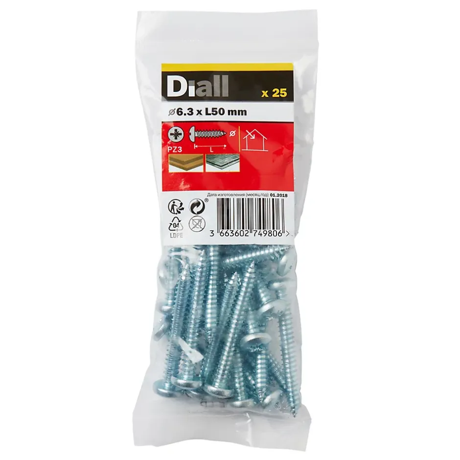 Les 25 vis zinguées autoperceuses à tête cylindrique de ce pack sont fabriquées à partir d’acier au carbone. Elles mesurent 50 mm de long, ont un diamètre de 6,3 mm et sont entièrement filetées. Elles sont idéales pour tout un éventail de projets de bricolage.