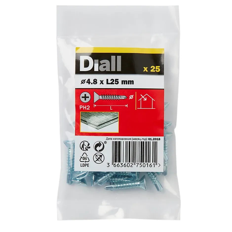 Vis métal auto-perceuses. Longueur du produit : 25 mm. Diamètre du produit : 4,8 mm. Type de filetage : Auto-perçant. Type embout : Pointe trempée.
