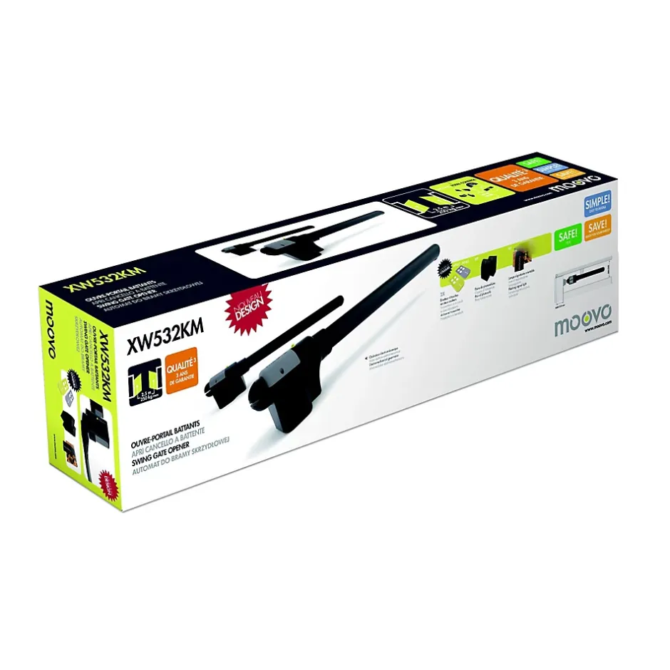 Ce kit Moovo XW532KM sert à automatiser un portail à usage résidentiel à deux battants. Le kit contient: 1 opérateur électromécanique avec logique de commande et récepteur intégré, 1 opérateur électromécanique esclave, 1 Notice d’installation, 1 Quincaillerie de montage Photocellules, 1 Clignotant, 2 Télécommandes 4 touches et 2 Clé de déblocage.